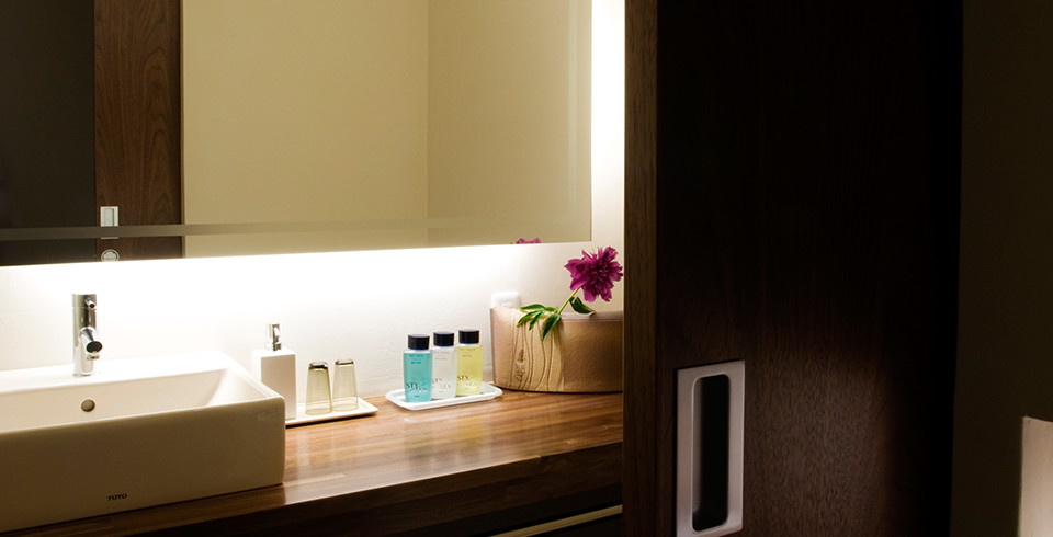 ホテル・旅館など、商業施設の家具を中心に空間プロデュース・インテリアデザインの第一線で活躍しているデザイナー"岩倉榮利氏"による寛ぎのためだけの和空間、露天風呂付桐和モダン客室。桐をふんだんに使用、壁には珪藻土を用いるなど、自然環境にも優しいお部屋で穏やかな、やさしい気持ちになってください。