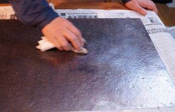 一部の色は、硫黄と反応させて銅板の表面に黒い膜を作り、それを徐々に磨き落とすことで作り出します。