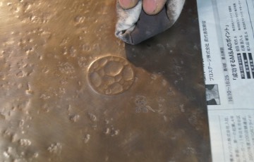 表面の模様は、古びたコンクリート床の模様を木槌で写し取ることで作り出します。