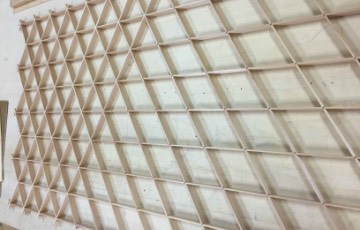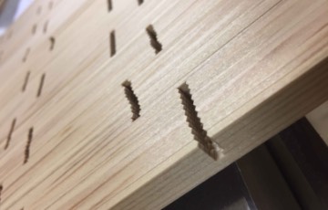 溝加工をした杉を菱形を組んでいき、「三組手」を組み立てます。
