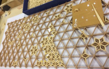 図面を元にして「三組手」に木曽桧で桜の花弁を模した「組子」を組み込んでいきます。